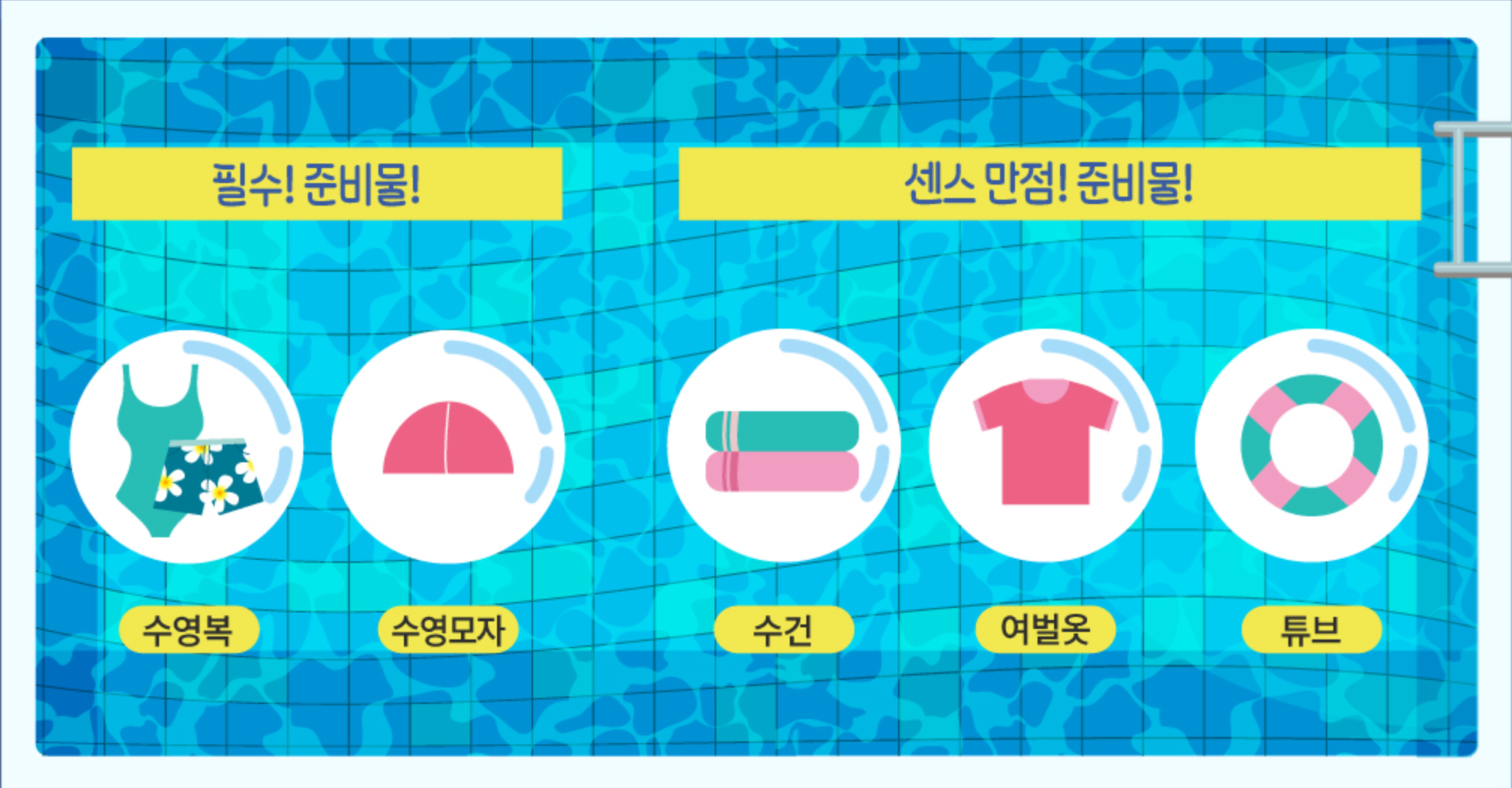 ✔️ 수영복과 수영모를 반드시 착용한 후 수영장에 들어가야 합니다. (반달모양 수영용 수영모만 허용)